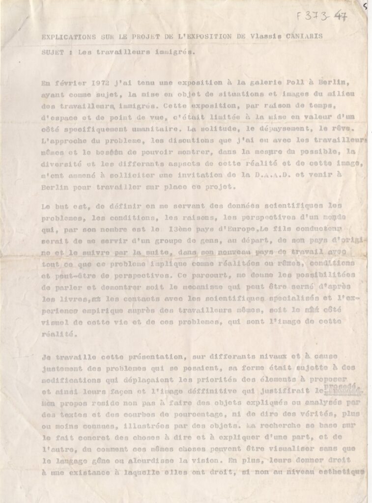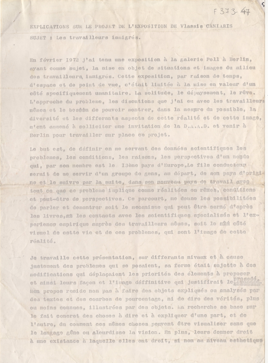 Κείμενο, δακτυλόγραφο, χαρτί, 2 φφ, 29,5×21 εκ., στα γαλλικά, με θέμα “Les travailleurs immigrés”, αναφορικά με το έργο του Βλάση Κανιάρη, προερχόμενο από ατομική του έκθεση στο Βερολίνο.