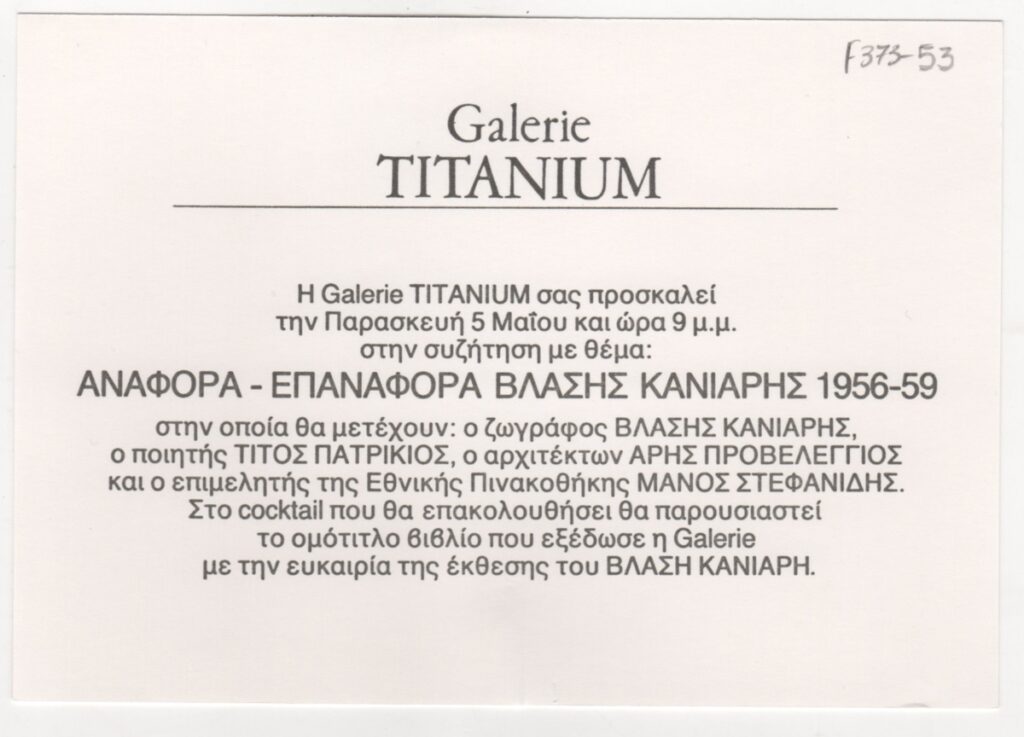 Πρόσκληση, χαρτόνι, 11,5×16,5 εκ., στα ελληνικά, σε συζήτηση, στο πλαίσιο ατομικής έκθεσης του Βλάση Κανιάρη στην Γκαλερί Titanium. Στη συζήτηση συμμετέχουν οι Τίτος Πατρίκιος, Βλάσης Κανιάρης, Άρης Προβελέγγιος, Μάνος Στεφανίδης.