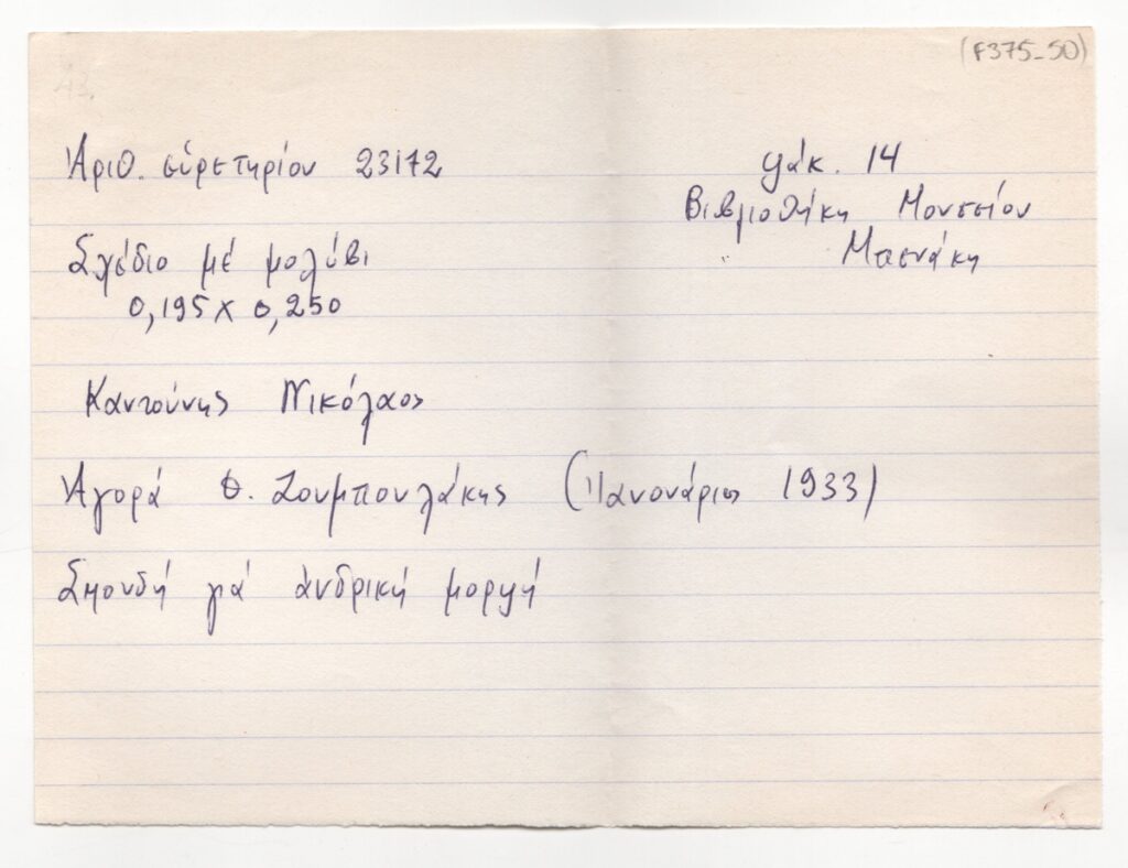 Στο Αρχείο Τώνη Π. Σπητέρη φυλάσσεται και δεύτερο αντίτυπο της φωτογραφίας με αρ. GR TITSpit f375_51 (στην πίσω όψη επιγραφή, χειρόγραφη, με μολύβι, στα ελληνικά: "Μουσείο Μπενάκη, φακ. 14, αριθ. 23142". Στην εγγραφή περιλαμβάνονται ψηφιακά αρχεία εικόνας και για τα δύο τεκμήρια.