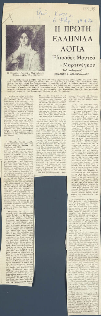 Απόκομμα της εφημερίδα «Ελεύθερος Κόσμος» (06/02/1977). Άρθρο του καθηγητή Φαίδωνα Κ. Μπουμπουλίδη για τη ζωή και το έργο της Ελισάβετ Μουτζά-Μαρτινέγκου. Εικονογραφείται με αναπαραγωγή προσωπογραφίας της που φιλοτέχνησε ο Νικόλαος Καντούνης.