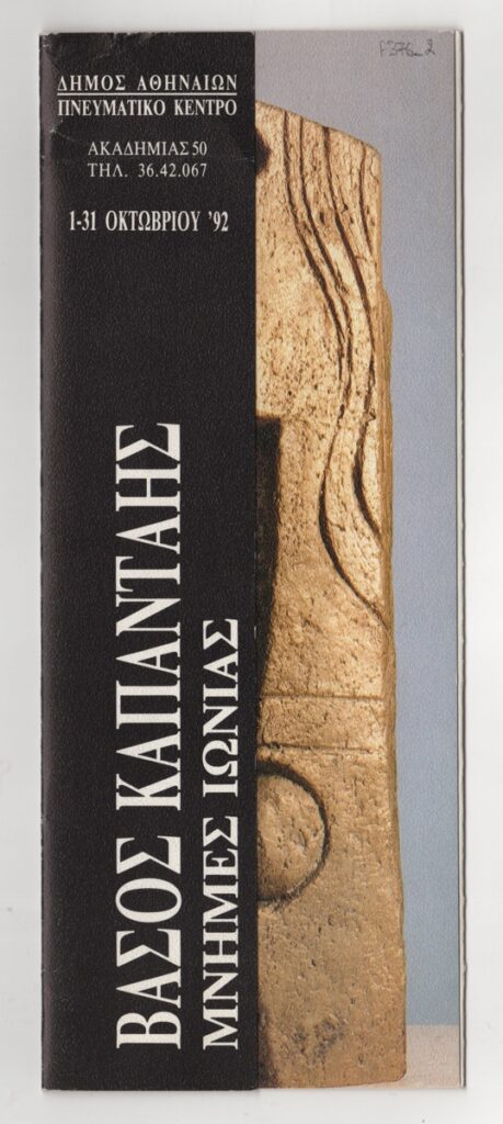 Έντυπο, στα ελληνικά, τετράπτυχο, χαρτόνι, 24,0×9,5 εκ. Αφορά την έκθεση γλυπτικής με τίτλο “Μνήμες Ιωνίας” στην Αθήνα το 1992. Περιλαμβάνει σύντομο βιογραφικό καλλιτέχνη, κατάλογο έργων έκθεσης, κείμενο της Αιμιλίας Γερουλάνου με την ιδιότητα της αντιπροέδρου του Διοικητικού Συμβουλίου του Πνευματικού Κέντρου Δήμου Αθηναίων και αποσπάσματα από το κείμενο του καλλιτέχνη με τίτλο “Βιογραφικά”. Εικονογραφείται με αναπαραγωγές έργων.
