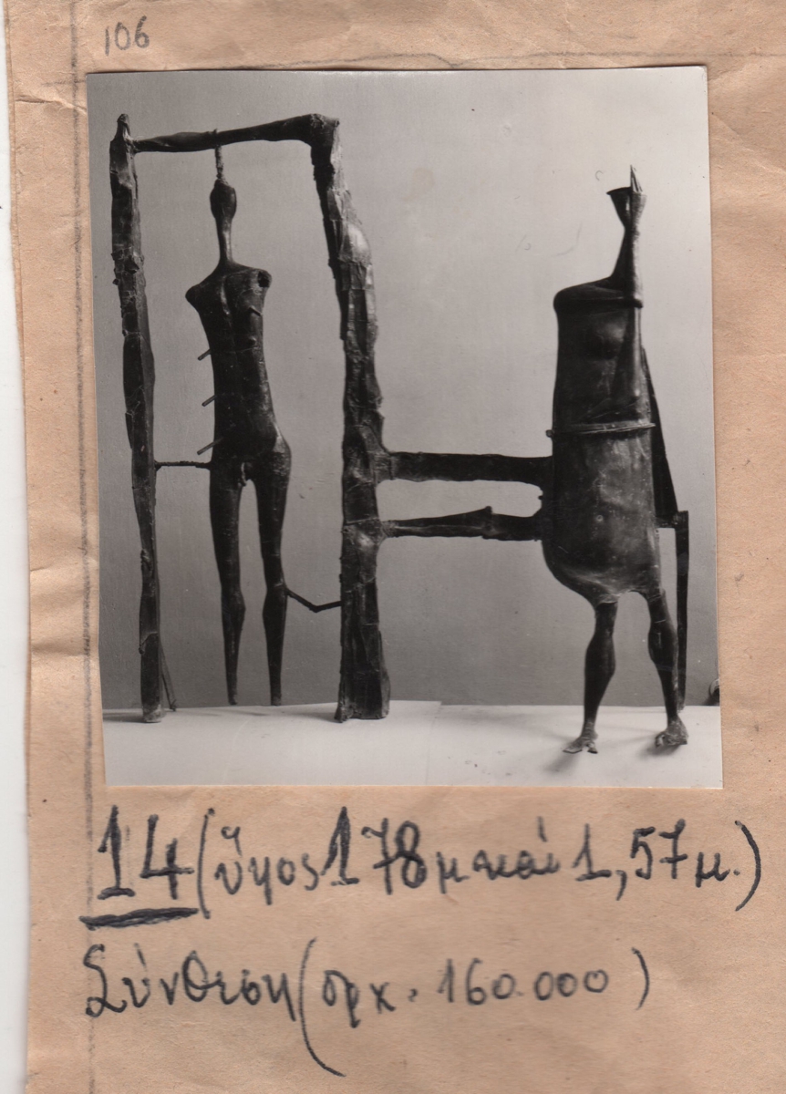 Φωτογραφία έργου, α/μ, σε φωτογραφικό χαρτί, 7,4×6,2 εκ. Το τεκμήριο είναι επικολλημένο μαζί με άλλες 29 φωτογραφίες έργων σε φύλλο χαρτιού, 54,5×64,0 εκ., όπου αποτυπώνονται με μολύβι τρία σχέδια έργων του καλλιτέχνη. Κάτω και δίπλα στη φωτογραφία επιγραφές με αρίθμηση, τίτλο έργου, τιμή πώλησης και διαστάσεις βάσης.