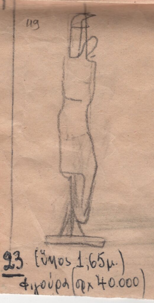 Σχεδιο έργου, με μολύβι, σε χαρτί. Το σχέδιο περιλαμβάνεται σε κολάζ 29 φωτογραφίών έργων σε φύλλο χαρτιού, 54,5×64,0 εκ., μαζί με άλλα δύοσχέδια έργων του καλλιτέχνη. Κάτω από το σχέδιο επιγραφή με αρίθμηση, τίτλο έργου, τιμή πώλησης.