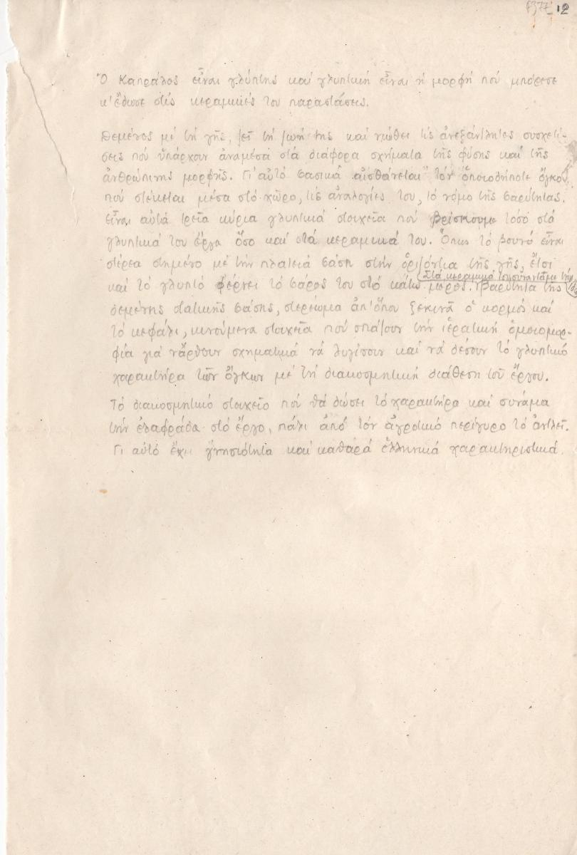 Χειρόγραφο προσχέδιο κειμένου του Τώνη Π. Σπητέρη για το γλυπτικό έργο του Χρήστου Καπράλου.