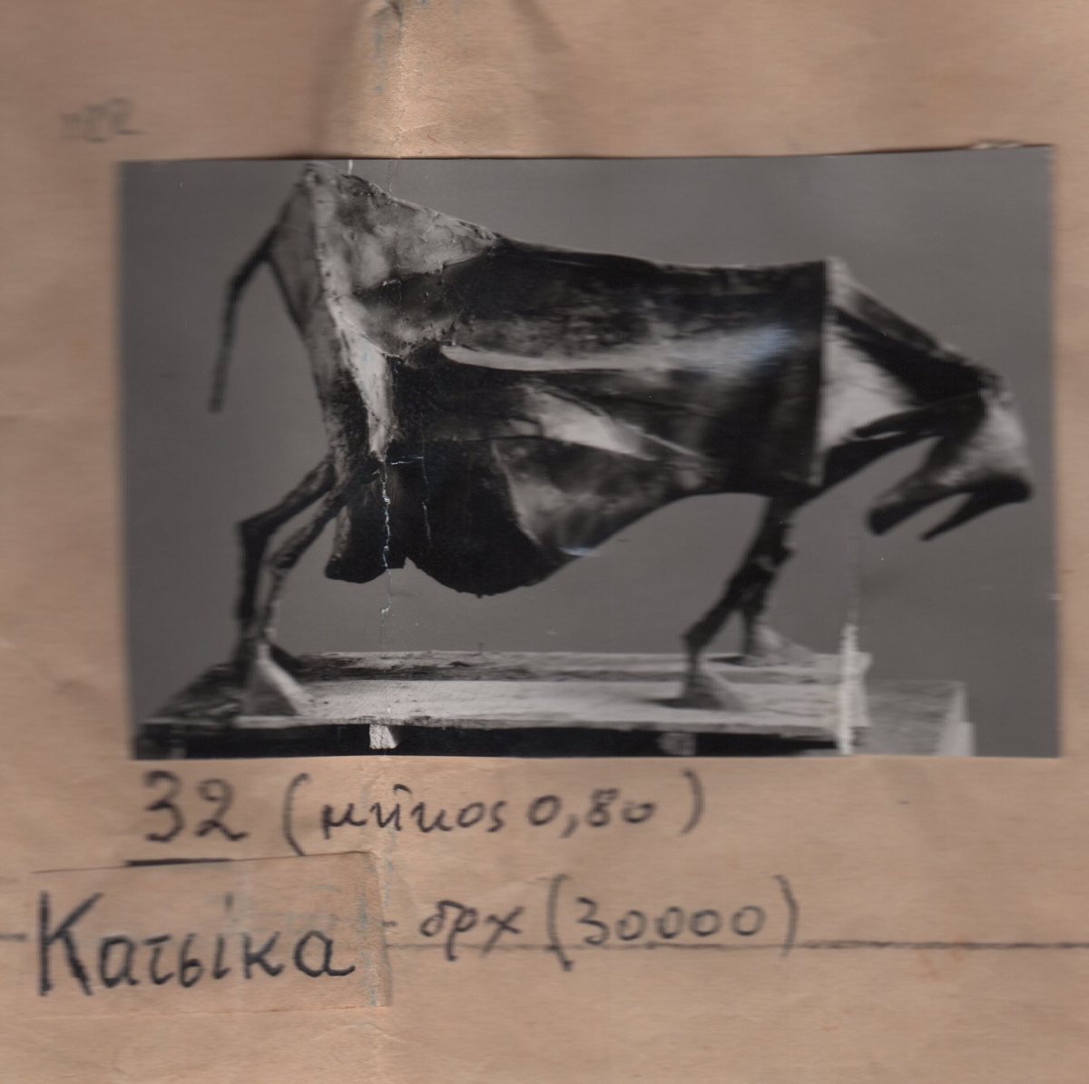 Φωτογραφία έργου, α/μ, σε φωτογραφικό χαρτί, 5,3×8,2 εκ. Το τεκμήριο είναι επικολλημένο μαζί με άλλες 29 φωτογραφίες έργων σε φύλλο χαρτιού, 54,5×64,0 εκ., όπου αποτυπώνονται με μολύβι τρία σχέδια έργων του καλλιτέχνη. Κάτω και δίπλα στη φωτογραφία επιγραφές με αρίθμηση, τίτλο έργου, τιμή πώλησης και διαστάσεις βάσης.