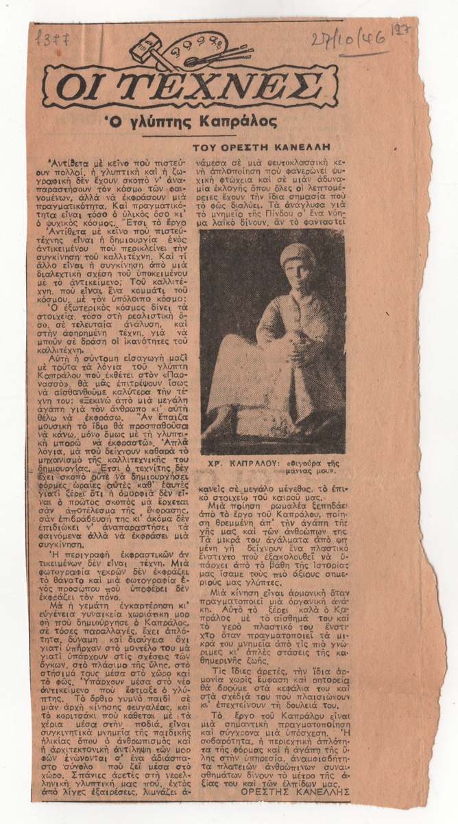Απόκομμα εφημερίδας (27/10/1946). Άρθρο του Ορέστη Κανέλλη για τον γλύπτη Χρήστο Καπράλο.