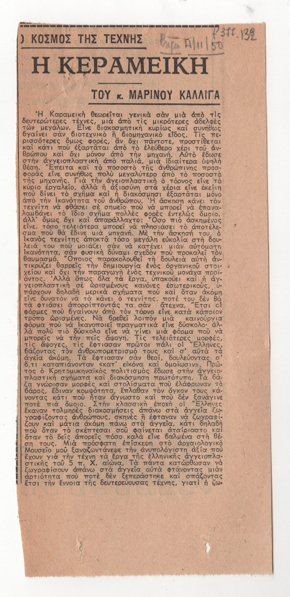 Απόκομμα της εφημερίδας “Το Βήμα” (04/11/1950). Εκτενής αναφορά του Μαρίνου Καλλιγά στην τέχνη της κεραμικής διαχρονικά και κριτική της έκθεσης κεραμικής του Χρήστου Καπράλου στην Αθήνα.
