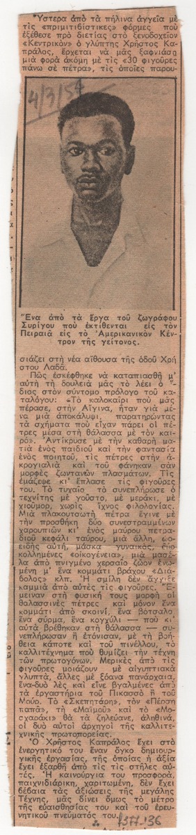 Απόκομμα εφημερίδας (04/03/1954) όπου δημοσιεύεται κριτική της έκθεσης κεραμικής του Χρήστου Καπράλου στην Αθήνα.