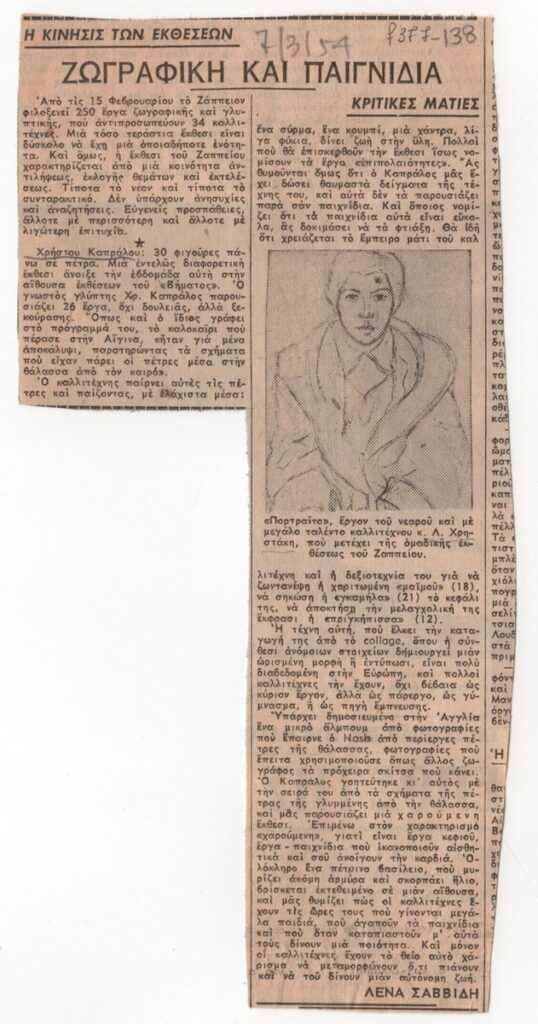 Απόκομμα εφημερίδας (07/03/1954). Κριτική της Λένας Σαββίδη για την έκθεση με τίτλο “30 φιγούρες πάνω σε πέτρα” του γλύπτη Χρήστου Καπράλου, στην Αθήνα. Αναφορά γίνεται επίσης στην ομαδική έκθεση του Ζαππείου την ίδια περίοδο.