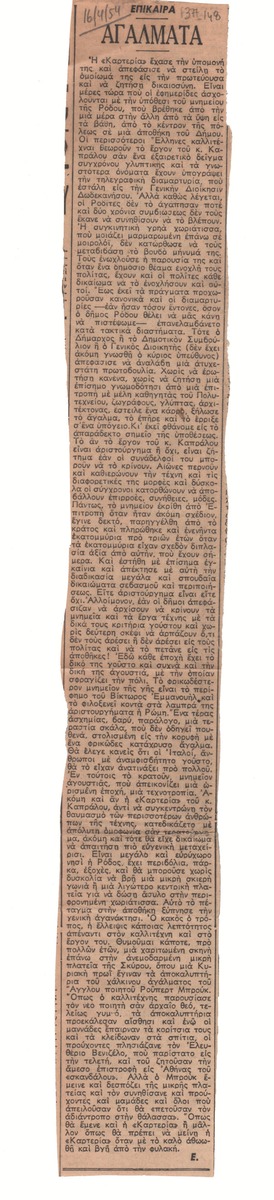 Απόκομμα εφημερίδας (16/04/1954). Δημοσίευμα σχετικά με την απόφαση της δημοτικής αρχής Ρόδου να απομακρύνει ως ακατάλληλο το γλυπτό του Χρήστου Καπράλου “Εθνική Καρτερία” από την κεντρική πλατεία της πόλης.