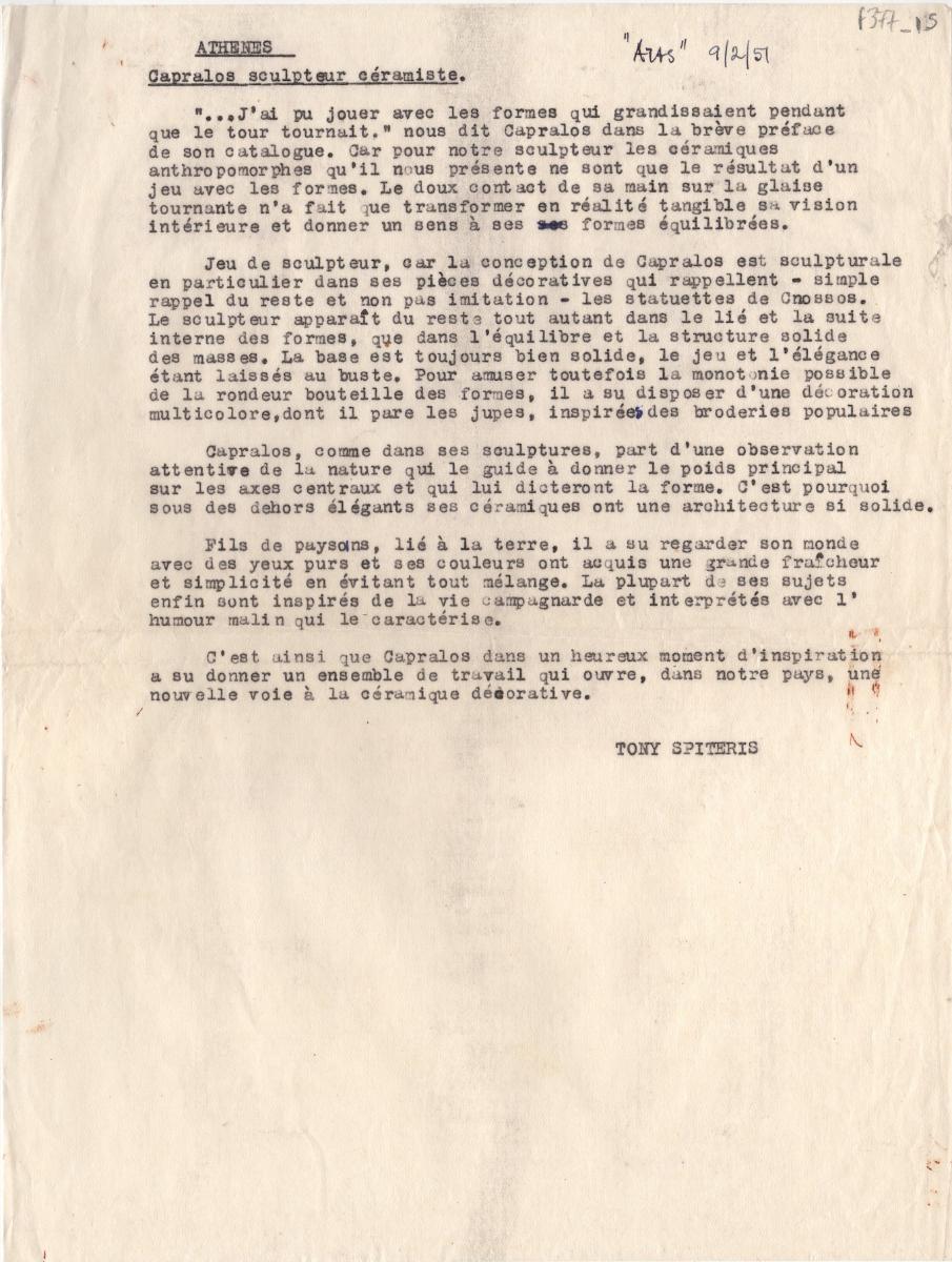 Δακτυλόγραφη κριτική του Τώνη Σπητέρη για τα κεραμικά του Χρήστου Καπράλου.
