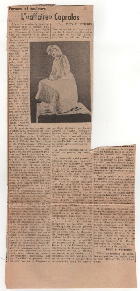 Απόκομμα εφημερίδας (22/04/1954) όπου δημοσιεύεται άρθρο του Τώνη Π. Σπητέρη σχετικά με την απόφαση της δημοτικής αρχής Ρόδου να απομακρύνει ως ακατάλληλο το γλυπτό του Χρήστου Καπράλου με τον τίτλο “Εθνική Καρτερία” από την κεντρική πλατεία της πόλης.