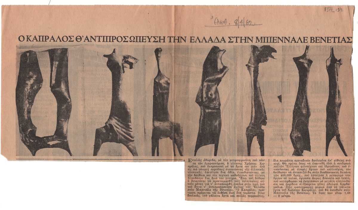 Απόκομμα της εφημερίδας “Ελευθερία” (08/04/1962), όπου δημοσιεύεται άρθρο για τη συμμετοχή της Ελλάδας στην 31η Biennale της Βενετίας με το έργο του Χρήστου Καπράλου.