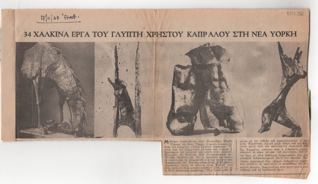 Απόκομμα της εφημερίδας “Ελευθερία” (17/11/1963), όπου δημοσιεύεται άρθρο σχετικά με την έκθεση γλυπτικής του Χρήστου Καπράλου στη Νέα Υόρκη.