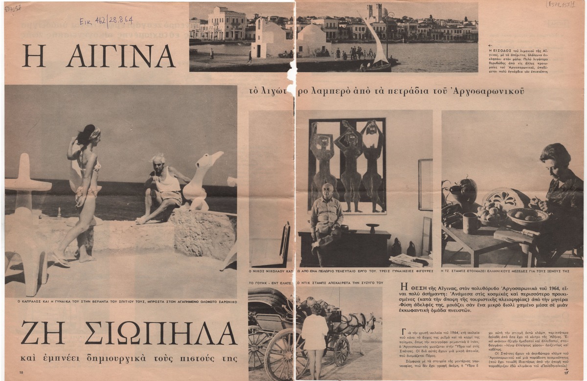 Απόκομμα του περιοδικού “Εικόνες” (28/08/1964). Φωτογραφικό ρεπορτάζ του Φρέντυ Γερμανού για τη ζωή και την καλλιτεχνική δημιουργία στο νησί της Αίγινας.
