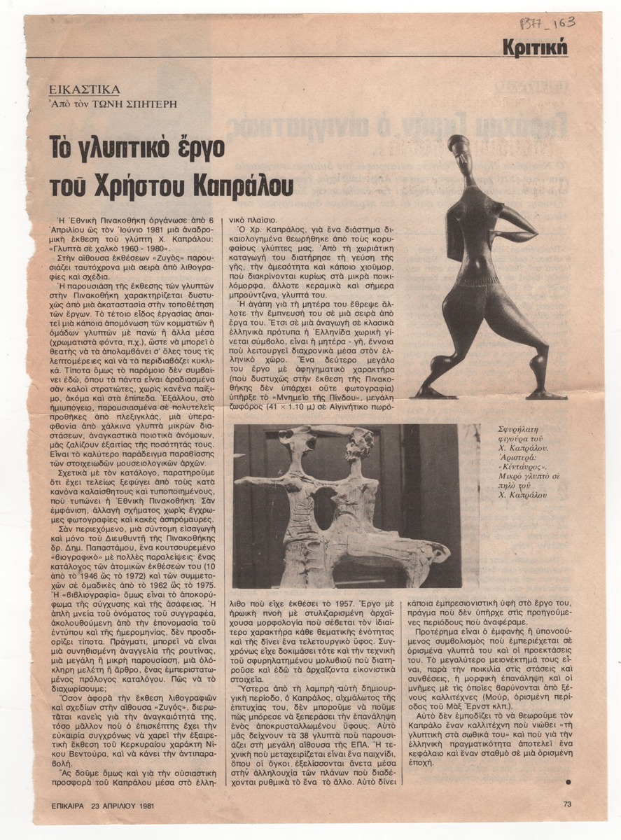 Απόκομμα του περιοδικού “Επίκαιρα” (23/04/1981) όπου δημοσιεύεται κριτική του Τώνη Π. Σπητέρη για την αναδρομική έκθεση του Χρήστου Καπράλου στην Αθήνα.
