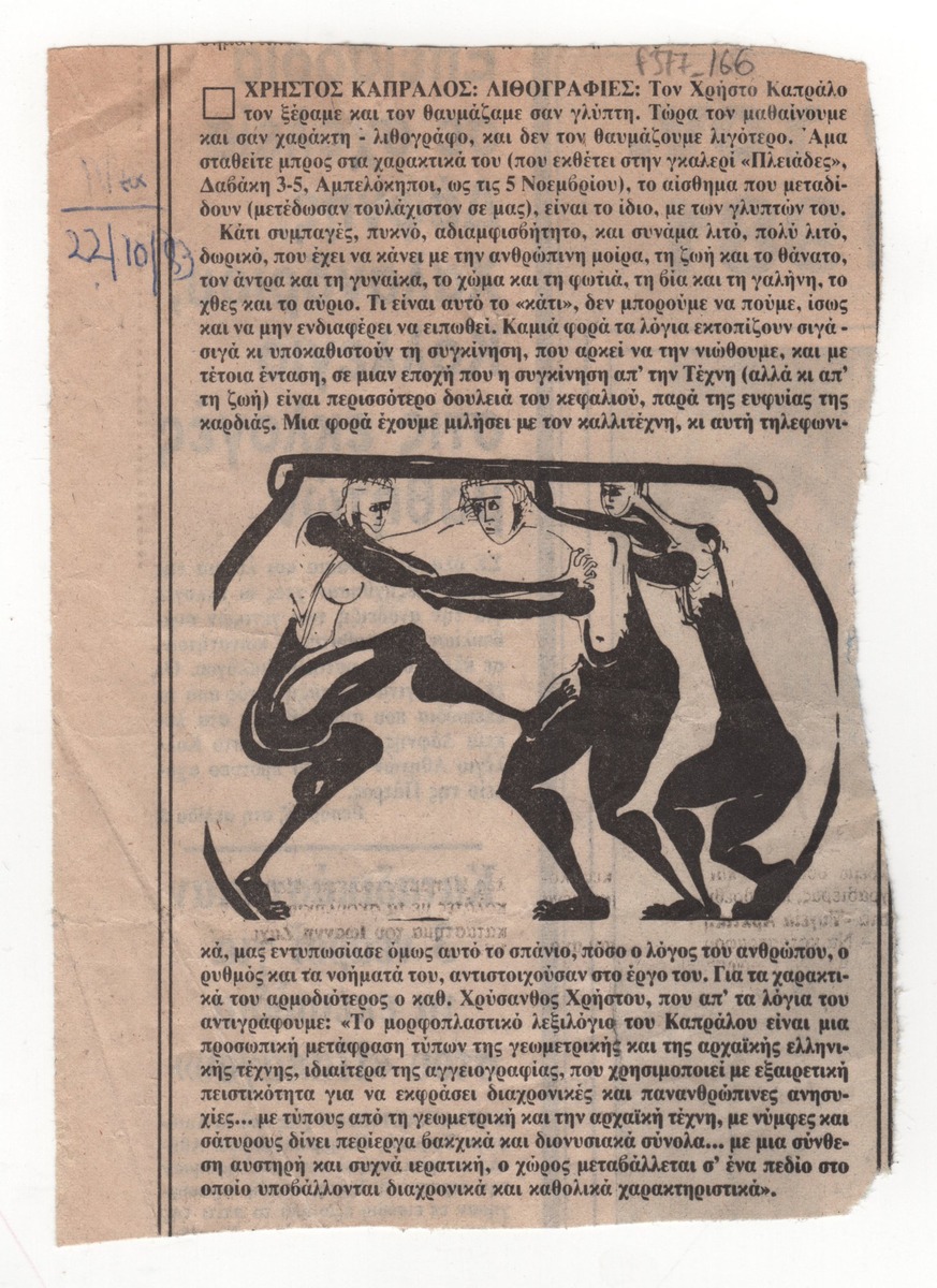 Απόκομμα της εφημερίδας “Τα Νέα” (22/10/1983), όπου δημοσιεύεται κριτική της έκθεσης λιθογραφίας του γλύπτη Χρήστου Καπράλου στην Αθήνα.