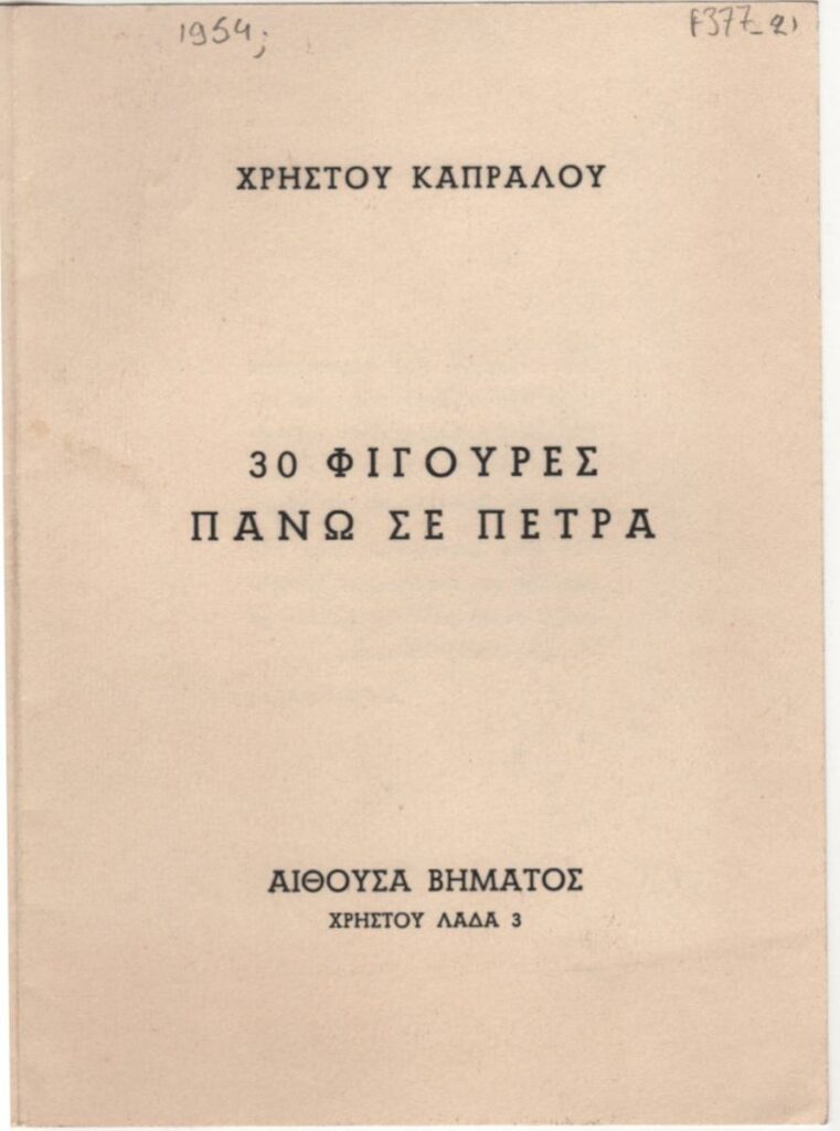 Έντυπο έκθεσης της ατομικής έκθεσης γλυπτικής του Χρήστου Καπράλου στην Αίθουσα Εκθέσεων του Βήματος στην Αθήνα. Περιέχει σύντομο κείμενο του καλλιτέχνη και κατάλογο έργων έκθεσης.