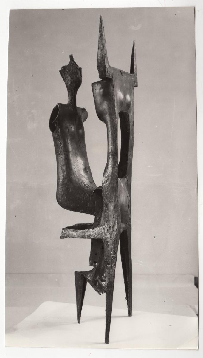 Ασπρόμαυρη εκτυπωμένη φωτογραφία έργου του Χρήστου Καπράλου. Στην πίσω όψη, επιγραφές και σφραγίδα καλλιτέχνη.