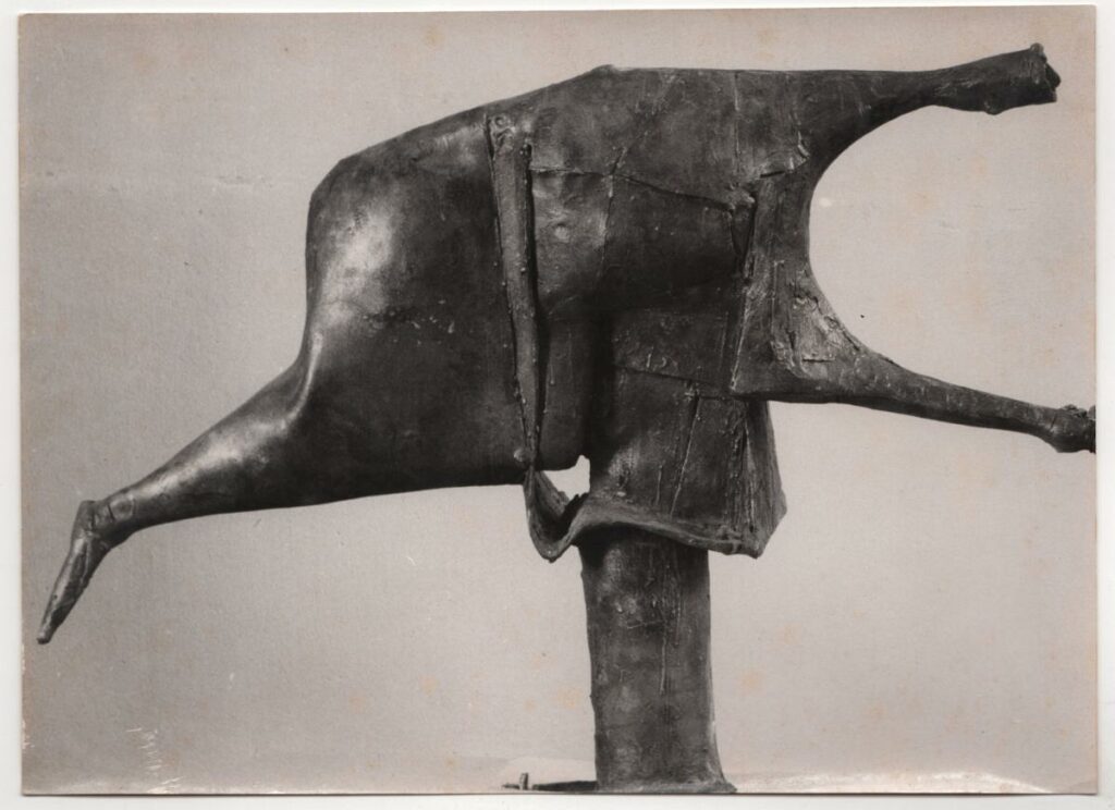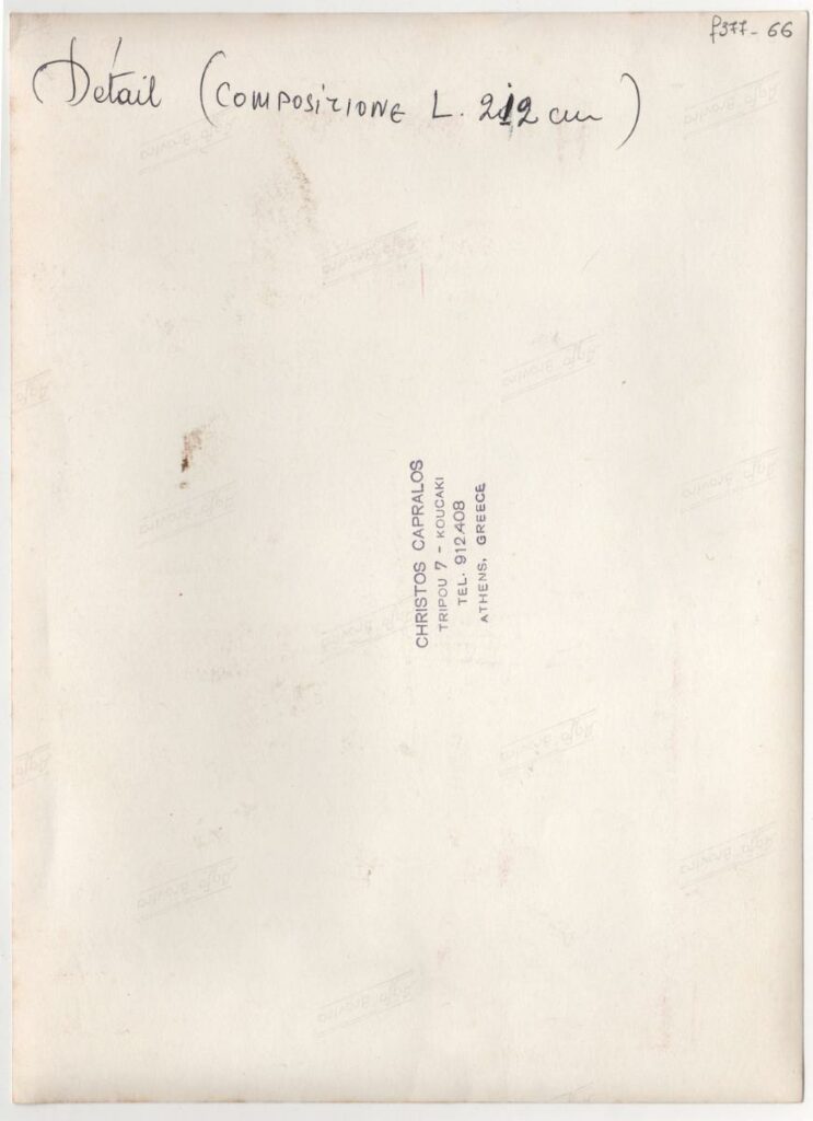 Ασπρόμαυρη εκτυπωμένη φωτογραφία έργου του Χρήστου Καπράλου. Στην πίσω όψη, επιγραφές και σφραγίδα του καλλιτέχνη.