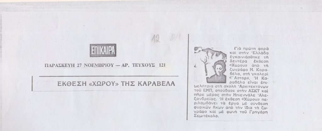 Φωτοαντίγραφο, χαρτί, 29,5×21 εκ., στα ελληνικά, δημοσίευσης κριτικής έκθεσης της Μαρίας Καραβέλα, η οποία διεξάγεται στην Γκαλερί Άστορ στην Αθήνα.