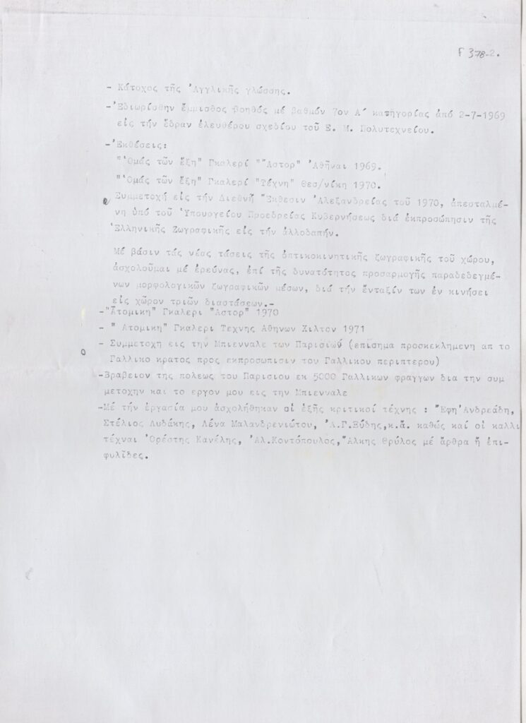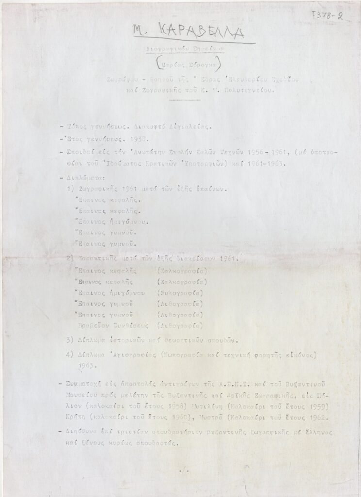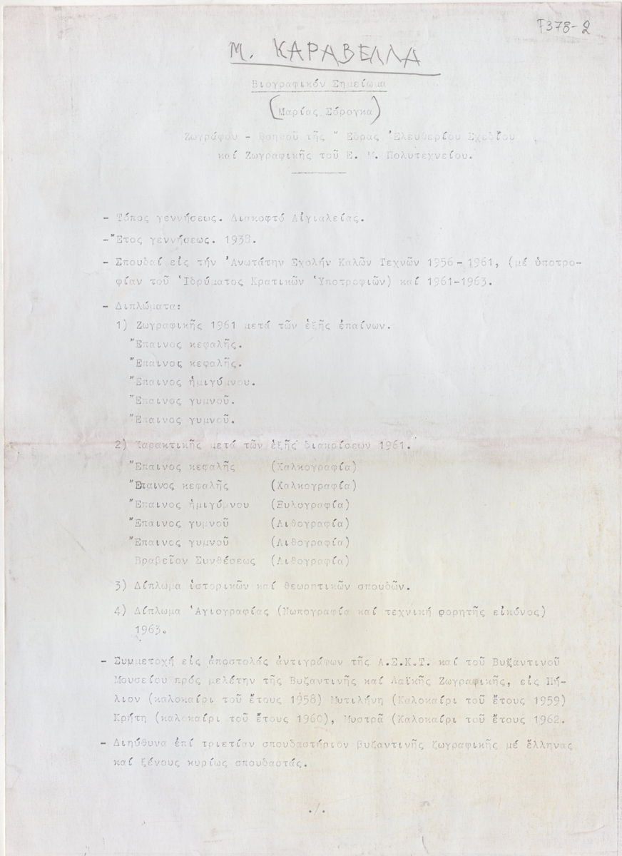 Φωτοαντίγραφο, δακτυλόγραφο, χαρτί, 2 φφ, 29,5×21 εκ., στα ελληνικά, βιογραφικού σημείωματος της Μαρίας Καραβέλα. Περιέχει προσωπικές πληροφορίες, σπουδές, εκθέσεις, ερευνητική δραστηριότητα.