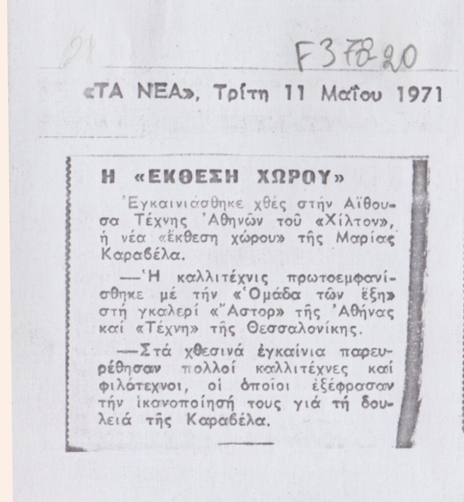 Φωτοαντίγραφο, χαρτί, 29.5×21 εκ., στα ελληνικά, δημοσίευσης κριτικής έκθεσης της Μαρίας Καραβέλα, η οποία διεξάγεται στην Αίθουσα Τέχνης Αθηνών Χίλτον.