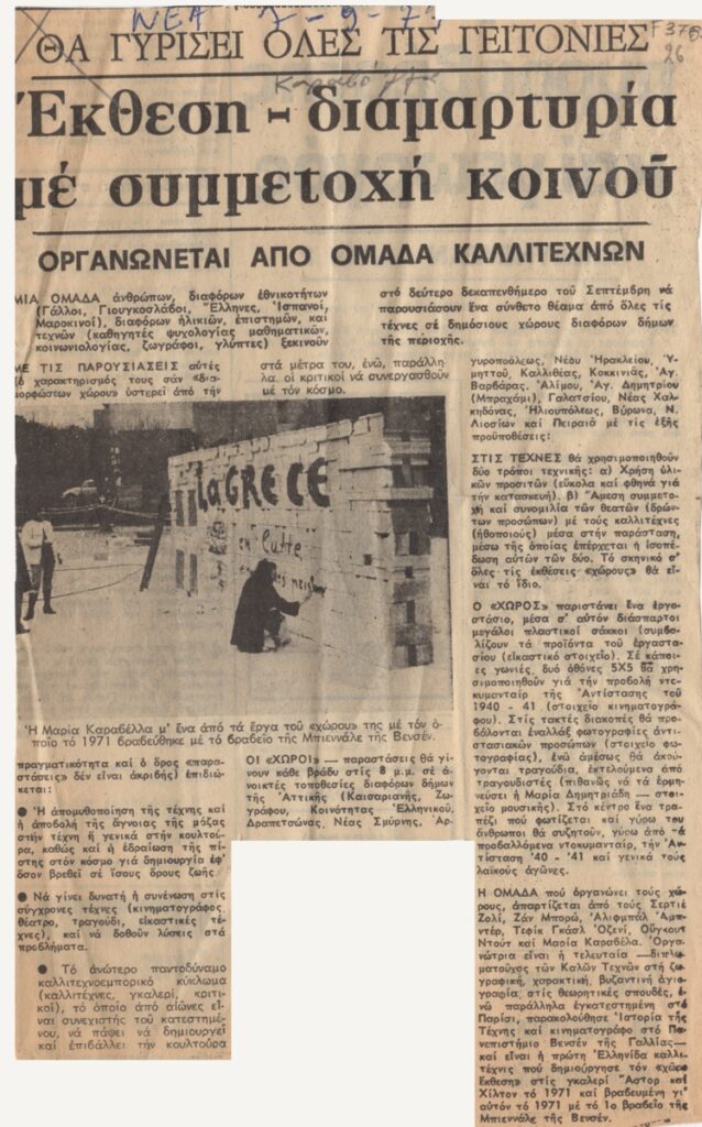 Απόκομμα, χαρτί ακανόνιστου μεγέθους, στα ελληνικά, δημοσίευσης άρθρου αναφερόμενου σε ομαδική έκθεση καλλιτεχνών διαφόρων κρατών υπο μορφή διαμαρτυρίας στην οποία θα συμμετέχει το κοινό. Ανάμεσα στους καλλιτέχνες η Μαρία Καραβέλα. Το απόκομμα εικονογραφείται και φέρει επιγραφές.