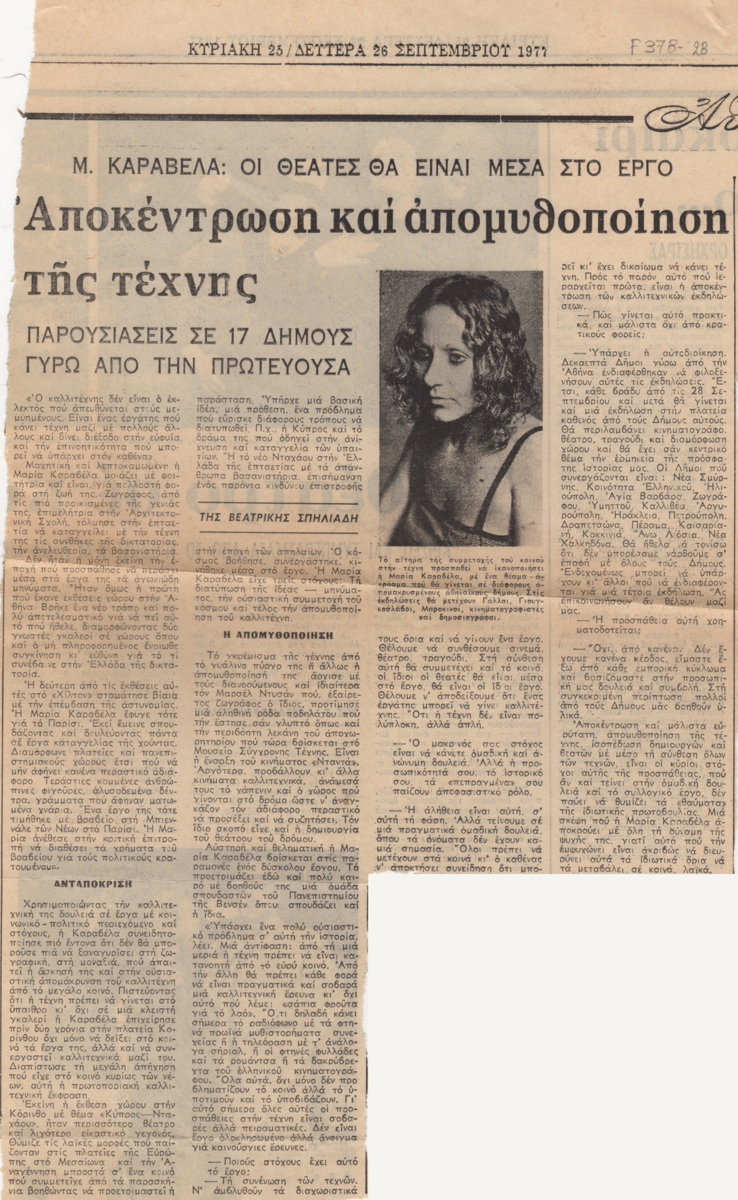 Απόκομμα, χαρτί, 35×20 εκ., στα ελληνικά, δημοσίευσης αναφερόμενης στην εικαστική παρουσία της Μαρίας Καραβέλα. Σημειώνεται πως η καλλιτέχνιδα ήταν η πρώτη που έκανε εκθέσεις ‘Χώρου’, τις οποίες παρουσίασε εκτός Αθηνών. Γίνεται λόγος για τις βραβεύσεις της, τη διαμονή της στο Παρίσι και τον αγώνα της κατά της Χούντας. Στο τέλος δίνεται απόσπασμα συνέντευξής της. Το απόκομμα εικονογραφείται.