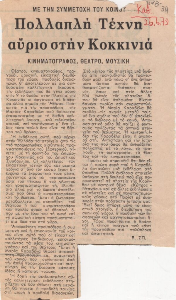 Απόκομμα, χαρτί, 20×11.5 εκ., στα ελληνικά, δημοσίευσης άρθρου το οποίο αναφέρεται στην “παράσταση” της Μαρίας Καραβέλα, με συνδυασμό θεάτρου, εικαστικών και μουσικής, αφιερωμένη στην Αντίσταση, που διοργανώνει στην πλατεία Κοκκινιάς στην Αθήνα. Το απόκομμα φέρει επιγραφές.