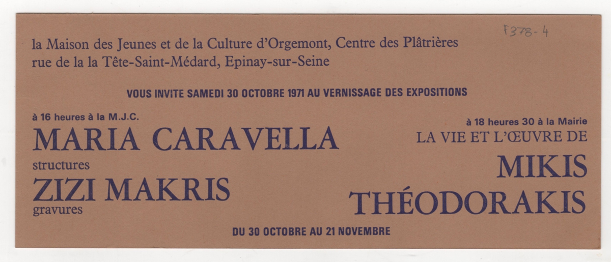 Πρόσκληση, χαρτόνι, 8,5×21 εκ., στα γαλλικά, παράλληλων εκθέσεων με γλυπτά και χαρακτική των Μαρίας Καραβέλα και Ζιζής Μακρή και θεματική για τη ζωή και το έργο του Μίκη Θεοδωράκη.