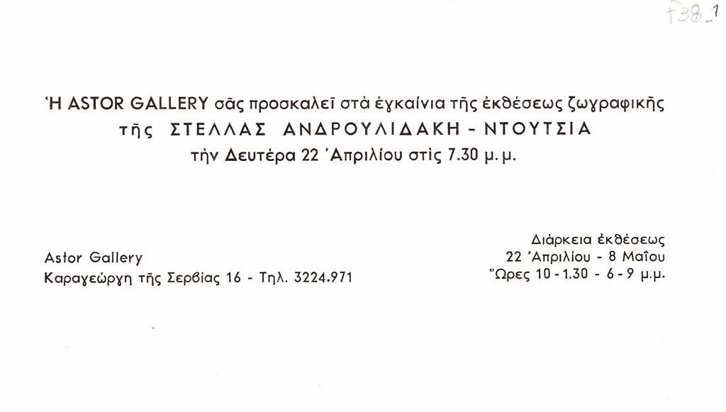 Πρόσκληση, χαρτόνι, 8,5×19,5εκ, στα ελληνικά, εγκαινίων έκθεσης της Στέλλας Ανδρουλιδάκη, στην γκαλερί Άστορ.