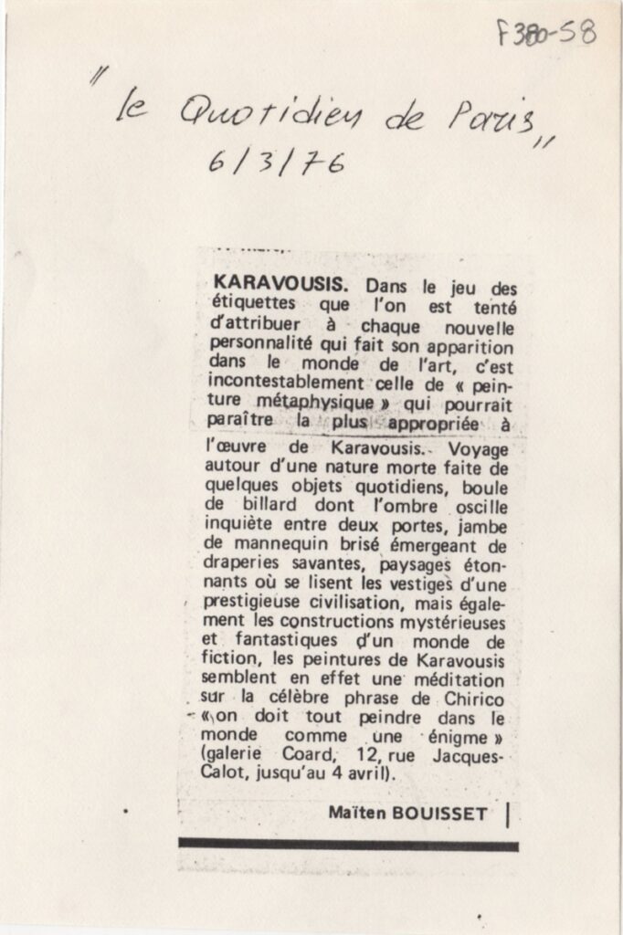 Φωτοαντίγραφο, χαρτί, 16×10,5 εκ., στα γαλλικά, δημοσίευσης κριτικής έκθεσης του Σαράντη Καραβούζη, η οποία διεξάγεται στο Παρίσι.