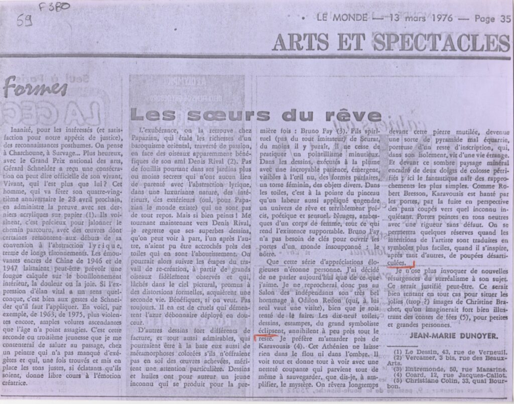 Φωτοαντίγραφο, χαρτί, 15,5×20 εκ., στα γαλλικά, δημοσίευσης κριτικής έκθεσης του Σαράντη Καραβούζη. Στο ίδιο, γίνεται λόγος για την αφαίρεση στη ζωγραφική, με αναφορά σε διάφορους καλλιτέχνες. Εντάσσεται στη στήλη “Arts et spectacles”.