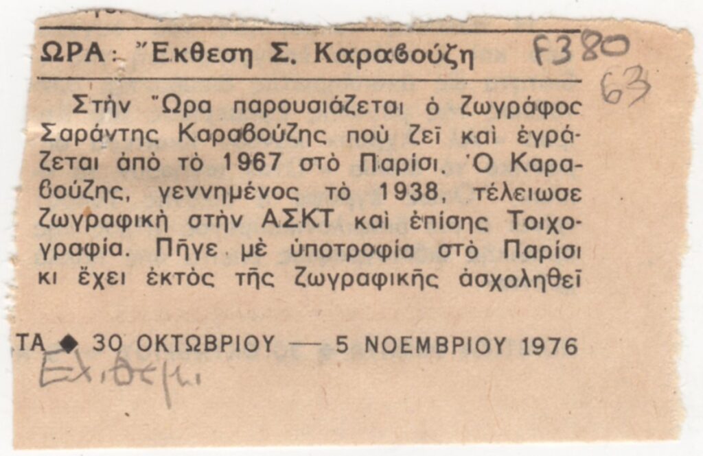 Απόκομμα, χαρτί, 2 φφ, 5×7 και 13×8 εκ., στα ελληνικά, δημοσίευσης κριτικής έκθεσης του Σαράντη Καραβούζη, η οποία διεξάγεται στο Καλλιτεχνικό Πνευματικό Κέντρο Ώρα, στην Αθήνα.