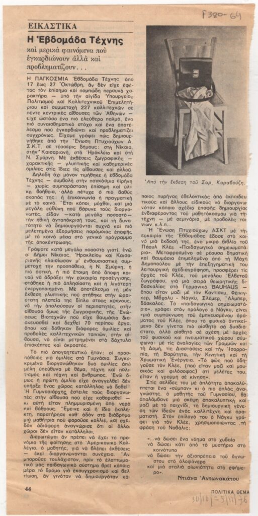 Απόκομμα, χαρτί, 28×13,5 εκ., στα ελληνικά, δημοσίευσης άρθρου το οποίο αναφέρεται στην Εβδομάδα Τέχνης που διοργανώθηκε από το Υπουργείο Πολιτισμού. Στο κείμενο γίνεται λόγος για τις δράσεις που εξελίχθηκαν και τα αποτελέσματά τους. Το απόκομμα εικονογραφείται και φέρει επιγραφές.