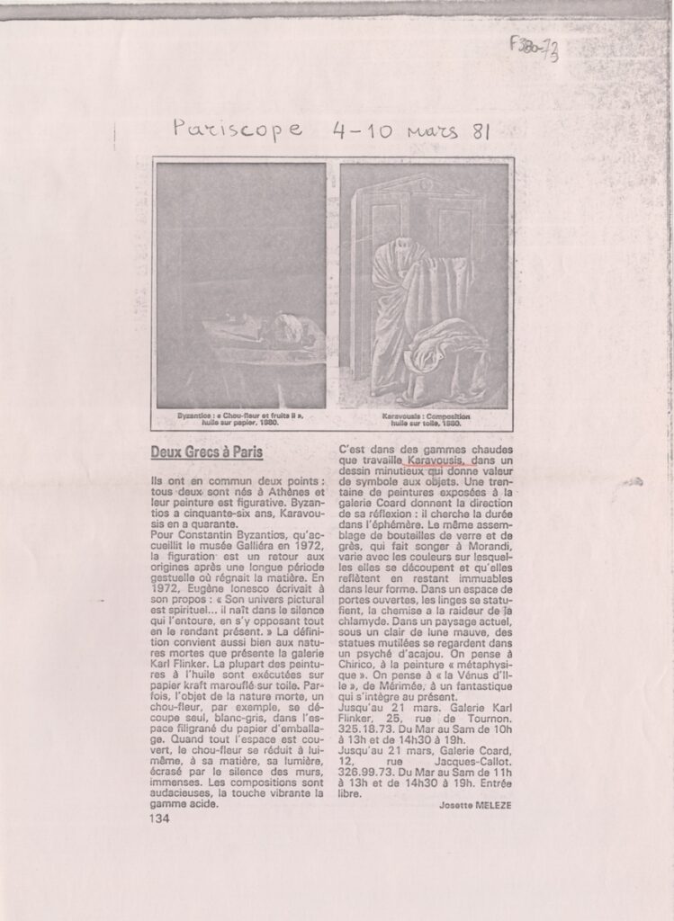 Φωτοαντίγραφο, χαρτί, 29,5×21 εκ., στα γαλλικά, δημοσίευσης κριτικής ατομικών εκθέσεων των Ντίκου Βυζάντιου και Σαράντη Καραβούζη στο Παρίσι.