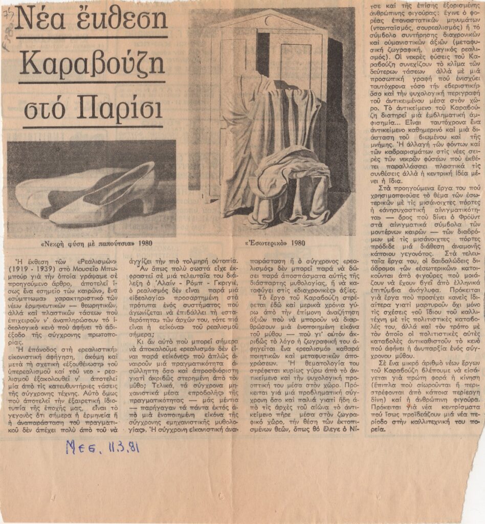 Απόκομμα, χαρτί, 22×20 εκ., στα ελληνικά, δημοσίευσης κριτικής έκθεσης του Σαράντη Καραβούζη, η οποία διεξάγεται στην Γκαλερί Coard στο Παρίσι.