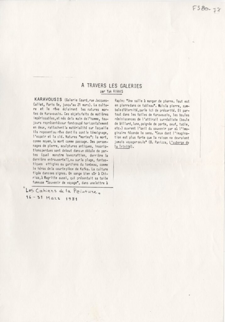 Φωτοαντίγραφο, χαρτί, 30×21 εκ., στα γαλλικά, δημοσίευσης κριτικής έκθεσης του Σαράντη Καραβούζη, η οποία διεξάγεται στην γκαλερί Coard στο Παρίσι. Φέρει επιγραφές.