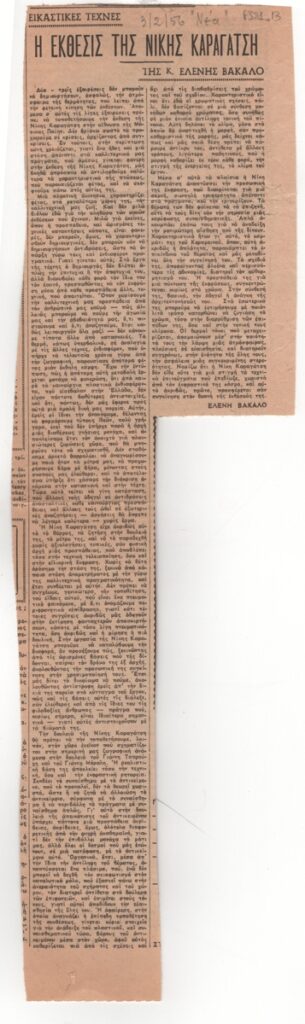 Απόκομμα, έντυπο, στα ελληνικά, χαρτί, 30,0×11,0 εκ. Κριτική της Ελένης Βακαλό για την έκθεση της Νίκης Καραγάτση στην Αθήνα το 1956. Πάνω από τον τίτλο επιγραφή με τα στοιχεία δημοσίευσης.