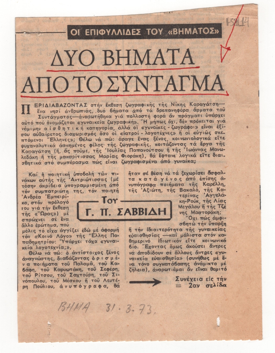 Αποκόμματα εφημερίδας, στα ελληνικά, χαρτί, 2 φφ., 15,5×11,5 και 27,0×20,4 εκ. Κριτική του Γ. Π. Σαββίδη για την ατομική έκθεση ζωγραφικής της Νίκης Καραγάτση στην Αθήνα το 1973. Με αφορμή το έργο της καλλιτέχνιδας ο Σαββίδης αναφέρεται γενικότερα στην κατάσταση της μελέτης της νεοελληνικης ζωγραφικής και τις δυσκολίες που συναντά ο ερευνητής κατά το έργο του. Αναφέρεται η έκδοση του Τώνη Π. Σπητέρη “Η τέχνη μετά το 1945 – Ελλάδα”. Στο πρώτο απόκομμα επιγραφή με τα στοιχεία της έκδοσης.