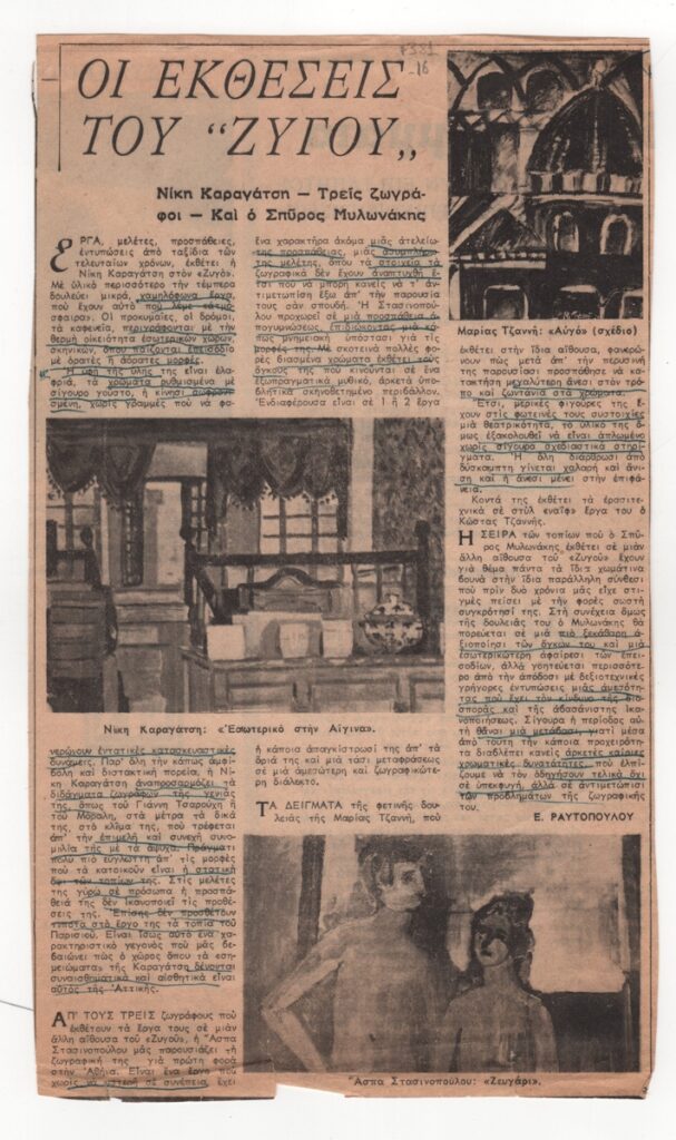 Απόκομμα, έντυπο, στα ελληνικά, χαρτί, 26,0×15,3 εκ. Κριτική της Έφης Ραυτοπόλου για την ατομική έκθεση ζωγραφικής της Νίκης Καραγάτση, την ομαδική έκθεση έργων της Άσπας Στασινοπούλου, Μαρίας Τζαννή και Κώστα Τζαννή και την ατομική έκθεσης τοπιογραφίας του Σπύρου Μυλωνάκη στην Αθήνα το 1963. Εικονογραφείται με αναπαραγωγές έργων. Το άρθρο φέρει υπογράμμιση με πράσινο μελάνι.