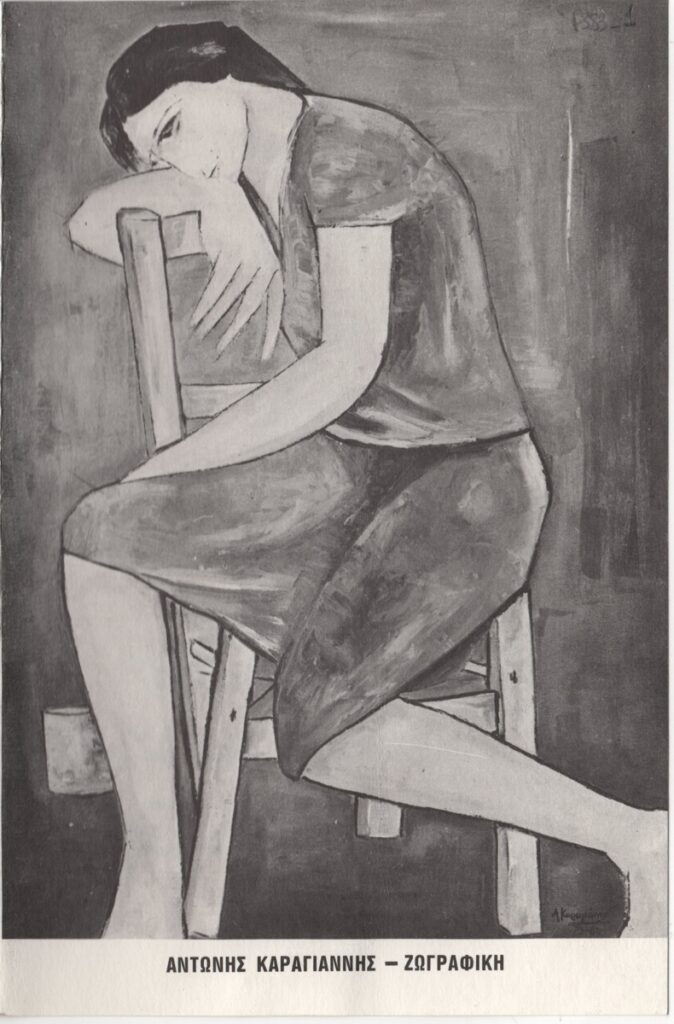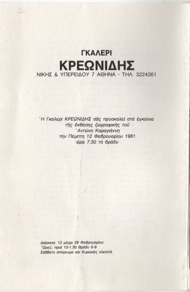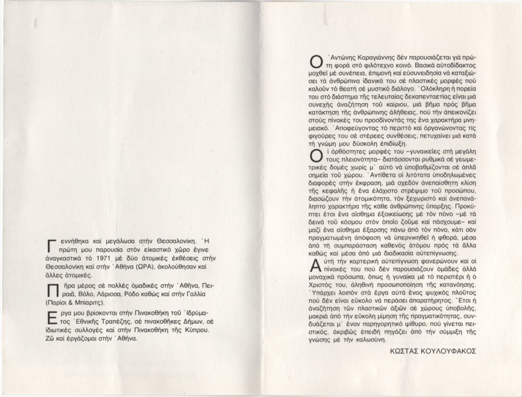 Έντυπο έκθεσης, στα ελληνικά, δίπτυχο, χαρτόνι, 21,2×14,0 εκ. Αφορά την ατομική έκθεση ζωγραφικής του Αντώνη Καραγιάννη στην Αθήνα το 1971. Περιέχει σύντομο βιογραφικό καλλιτέχνη (σε πρώτο πρόσωπο) και κριτική για τον καλλιτέχνη και το έργο του του Κώστα Κουλουφάκου. Το εξώφυλλο εικονογραφείται με αναπαραγωγή έργου.