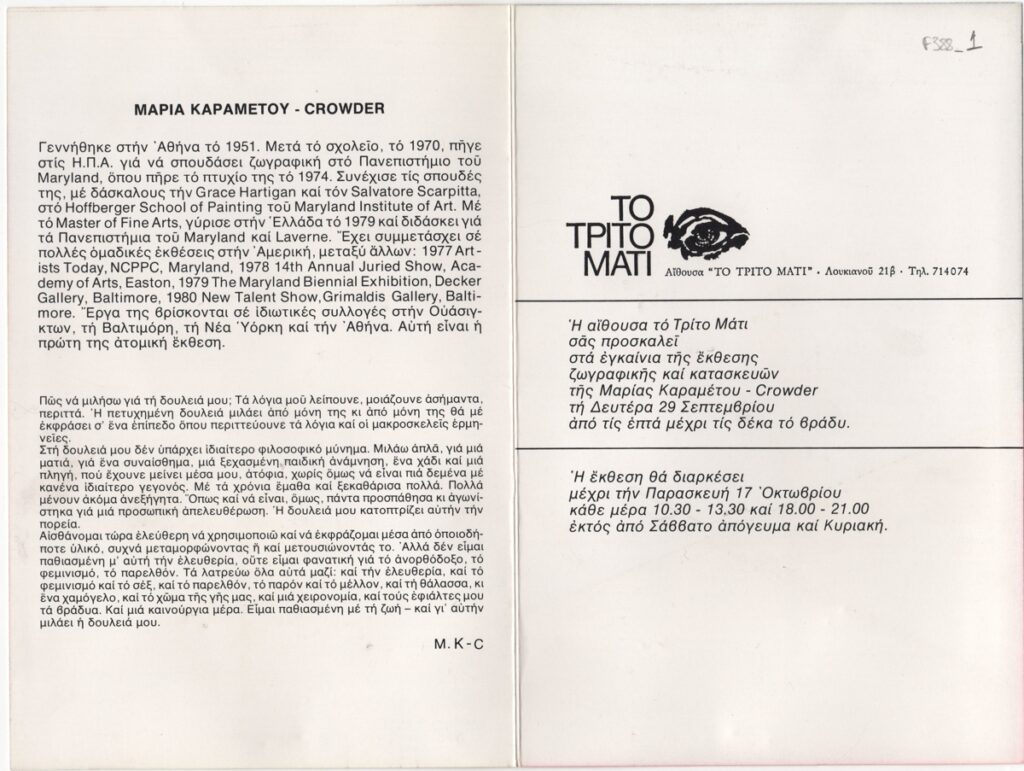 Έντυπο έκθεσης, στα ελληνικά, δίπτυχο, χαρτόνι ιλουστρασιόν, 21,0×14,0 εκ. Αφορά την ατομική έκθεση ζωγραφικής της Μαρίας Καραμέτου-Crowder στην Αθήνα [το 1980]. Περιέχει σύντομο βιογραφικό και κείμενο της καλλιτέχνιδας. Εξωτερικά το έντυπο εικονογραφείται με αναπαραγωγές έργων.