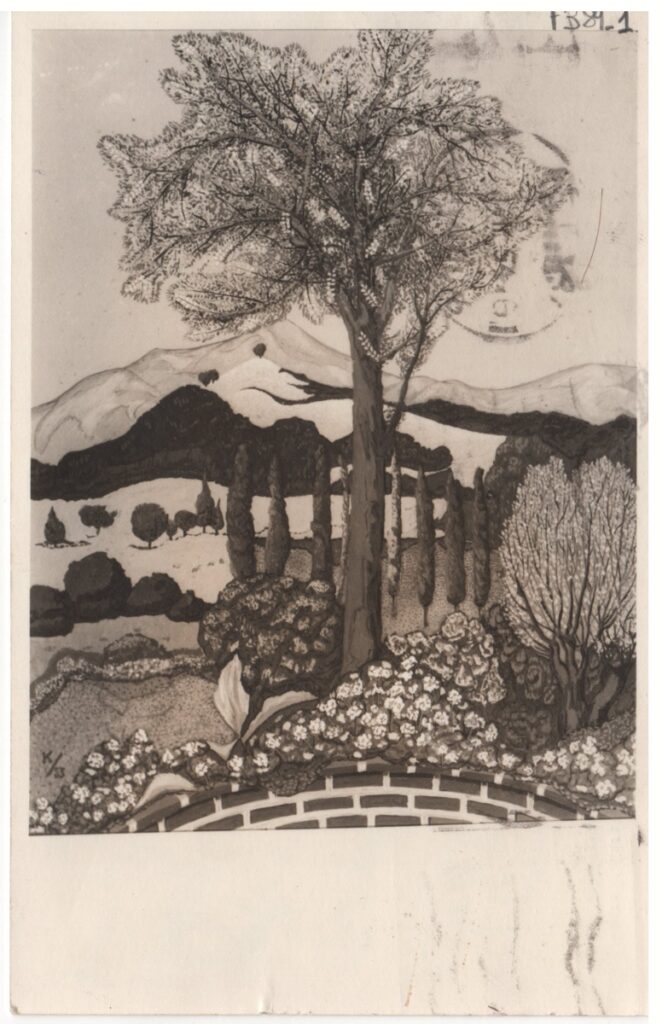 Ταχυδρομική κάρτα, έντυπη, χαρτόνι, 9,0×13,8 εκ. Στη μία όψη, αναπαραγωγή έργου του Σωκράτη Καραντινού. Στην άλλη όψη, ευχετήρια επιστολή του Σωκράτη Καραντινού προς τον Τώνη Σπητέρη. Επικολλημένο γραμματόσημο. Σφραγίδα ταχυδρομείου.