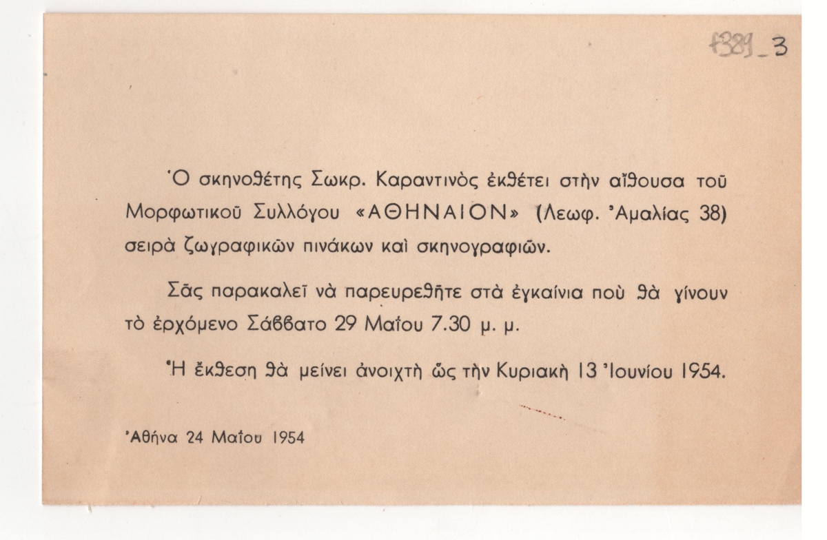 Έντυπο, μονόφυλλο, σε χαρτόνι, 9,0×13,8 εκ. Πρόσκληση της ατομικής έκθεσης ζωγραφικών πινάκων και σκηνογραφιών του σκηνοθέτη Σωκράτη Καραντινού στην Αθήνα το 1954.