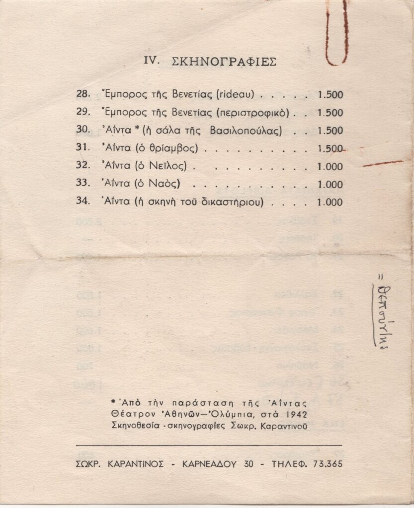Έντυπο, με συμπληρώσεις, χειρόγραφες, με μπλε μελάνι, στα ελληνικά, δίπτυχο, χαρτί, 17,0×14,2 εκ. Τιμοκατάλογος των έργων της ατομικής έκθεσης ζωγραφικής και σκηνογραφίας του σκηνοθέτη Σωκράτη Καραντινού στην Αθήνα το 1954.