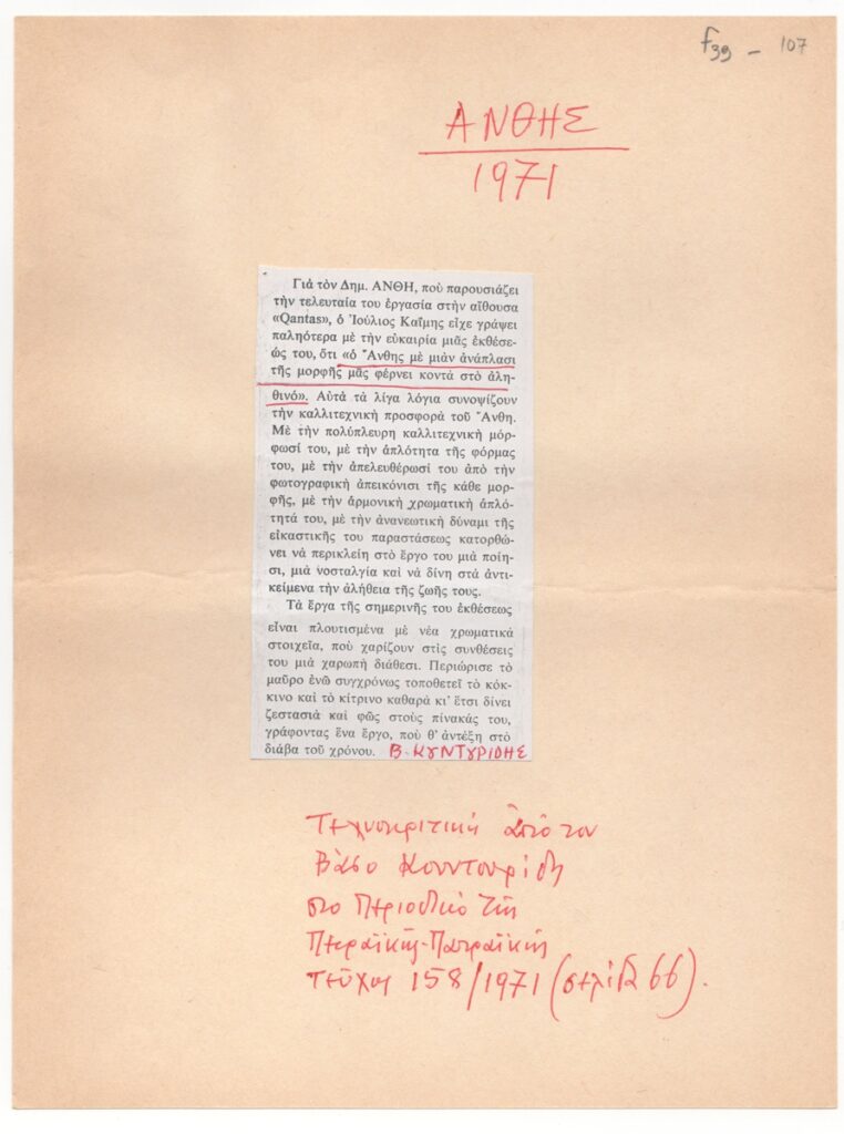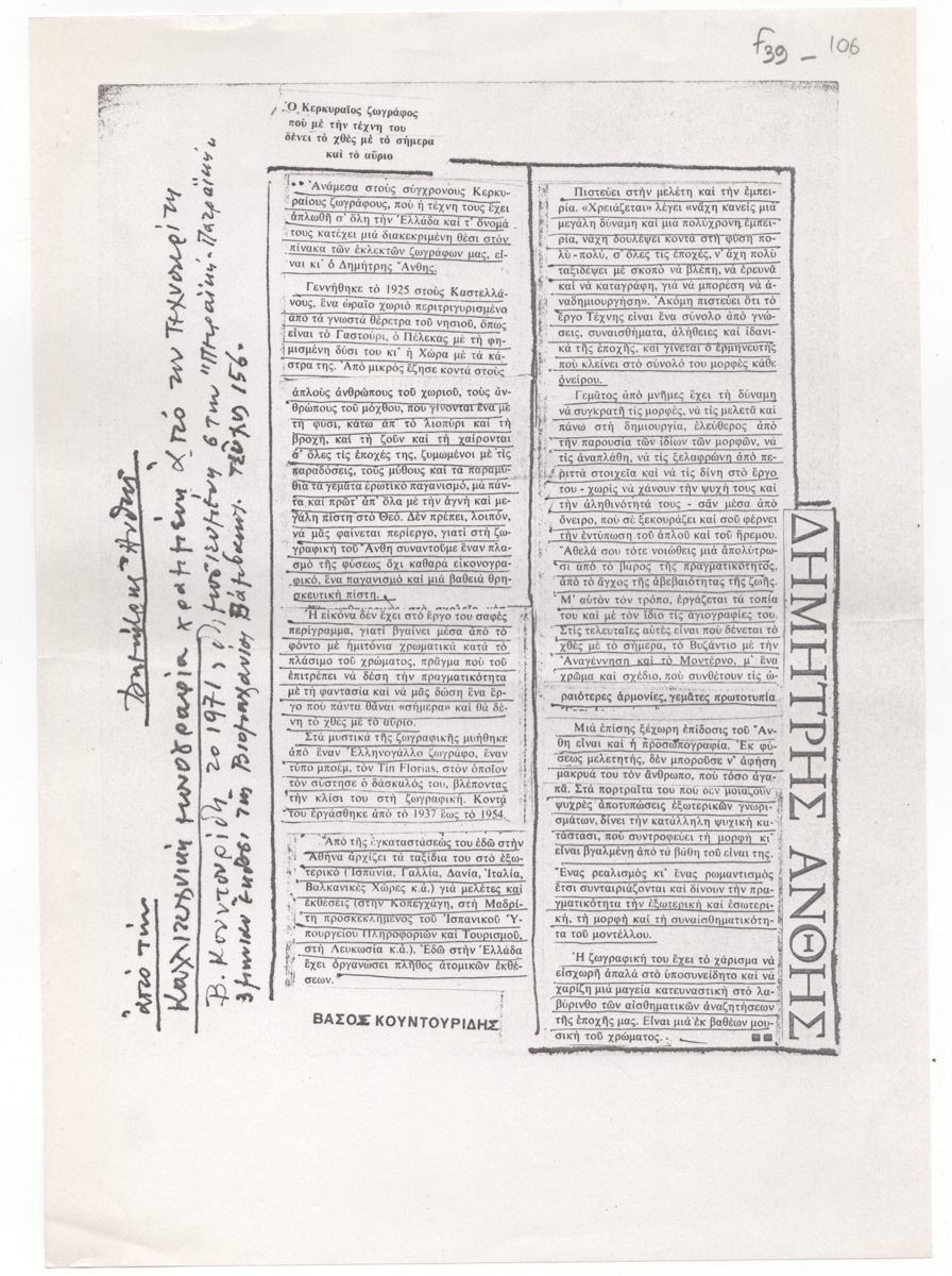 Φωτοαντίγραφο κολάζ αποκομμάτων, χαρτί, 29,7×21,2 εκ. Σύνθεση αποσπασμάτων από μονογραφία του Β. Κουντουρίδη για τον καλλιτέχνη. Στο πρωτότυπο επιγραφές.