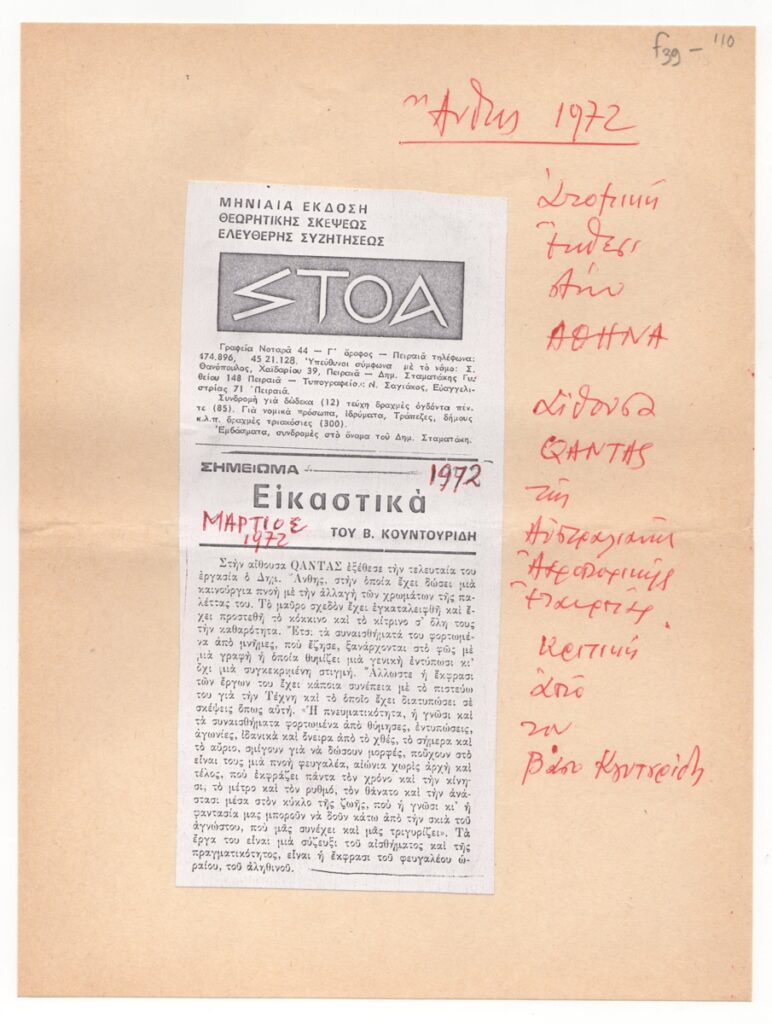 Φωτοαντίγραφο αποκόμματος, έντυπο, στα ελληνικά, χαρτί, 20,5×9,5 εκ. Επικολλημένο σε φύλλο χαρτιού, 28,5×21,5 εκ. Κριτική για την ατομική έκθεση έργων του Δημήτρη Άνθη στην Αθήνα το 1972. Εντάσσεται στη στήλη “Εικαστικά”. Στο φύλλο επιγραφή με τα στοιχεία της δημοσίευσης.