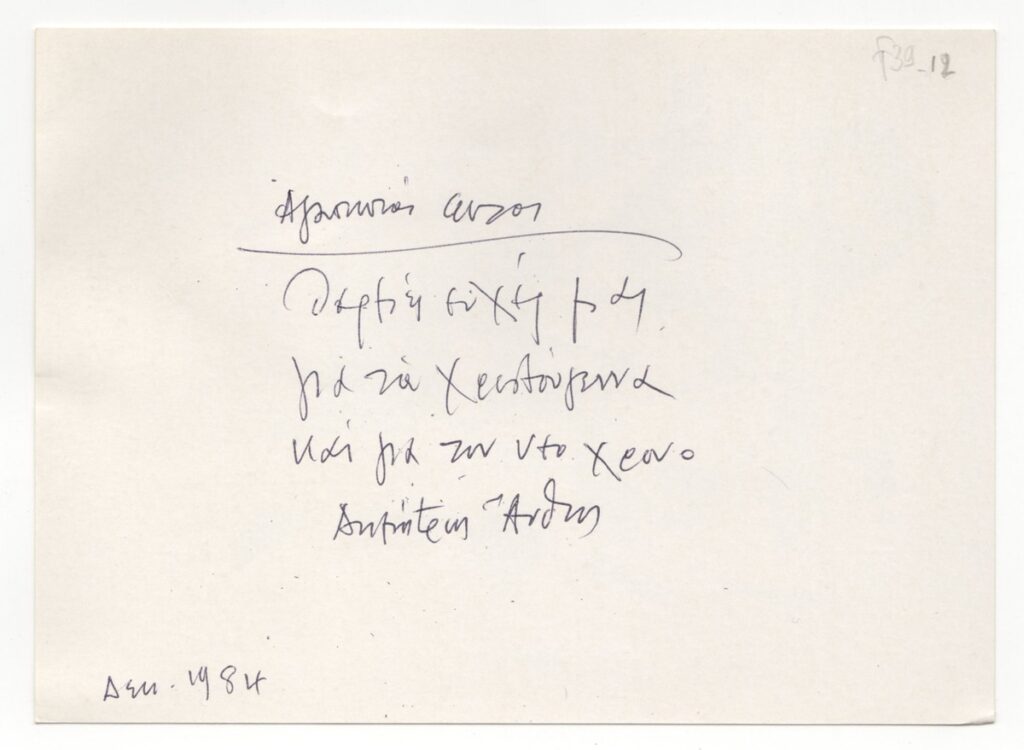 Ευχετήρια κάρτα. Στη μία όψη, αναπαραγωγή έργου του Λυκούργου Κογεβίνα. Στην πίσω όψη ιδιόγραφες ευχές του Δημήτρη Άνθη για τον νέο χρόνο.